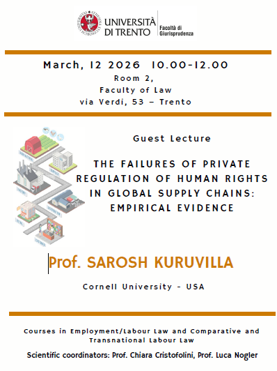 Da Gio, 12/03/2026 a Gio, 12/03/2026 Mode On-site-only File Programma146.65 KB 10/03/2026 The Failures of Private Regulation of Human Rights in Global Supply Chains: Empirical Evidence on-site only h. 10:00 | Via Verdi 53, Trento Università di Trento Facoltà di Giurisprudenza - Aula 2
