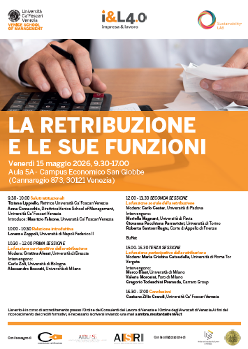 Da Ven, 15/05/2026 a Ven, 15/05/2026 Mode On-site-only File Programma1.33 MB 12/03/2026 La retribuzione e le sue funzioni on-site only h. 9:30 | Cannaregio 873, Venezia Università Ca' Foscari Venezia Aula 5A - Campus Economico San Giobbe