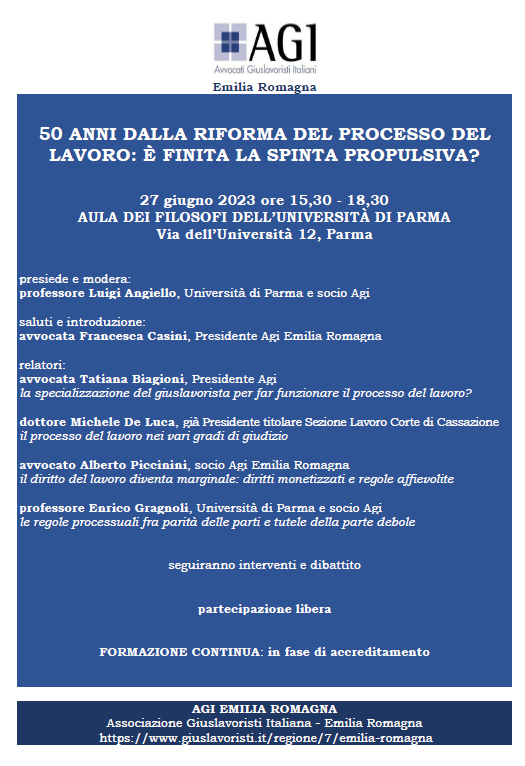 Da Mar, 27/06/2023 a Mar, 27/06/2023 Mode On-site-only File Programma97.24 KB 21/06/2023 50 anni dalla riforma del processo del lavoro: è finita la spinta propulsiva? on-site only h. 15:30 | Via dell’Università 12, Parma AGI Emilia Romagna Aula dei Filosofi - Università di Parma