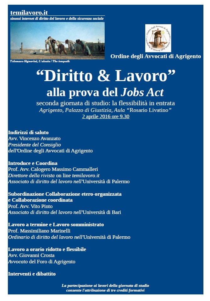 Da Sab, 02/04/2016 a Sab, 02/04/2016 Mode On-site-only 14/11/2022 AGRIGENTO - “Diritto & Lavoro” alla prova del Jobs Act | seconda giornata di studio: la flessibilità in entrata on-site only | Palazzo di Giustizia, Aula “Rosario Livatino” - ore 9.30