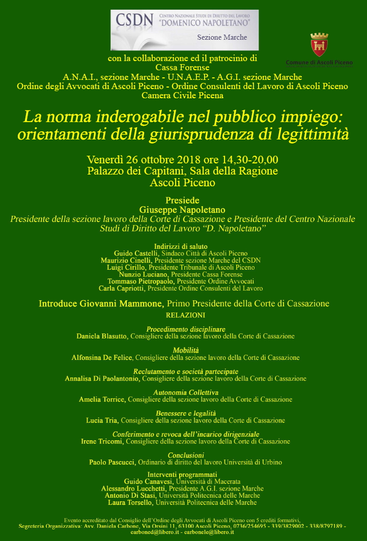 Da Ven, 26/10/2018 a Ven, 26/10/2018 Mode On-site-only 14/11/2022 ASCOLI PICENO - La norma inderogabile nel pubblico impiego: orientamenti della giurisprudenza di legittimità on-site only | Palazzo dei Capitani - ore 14.30