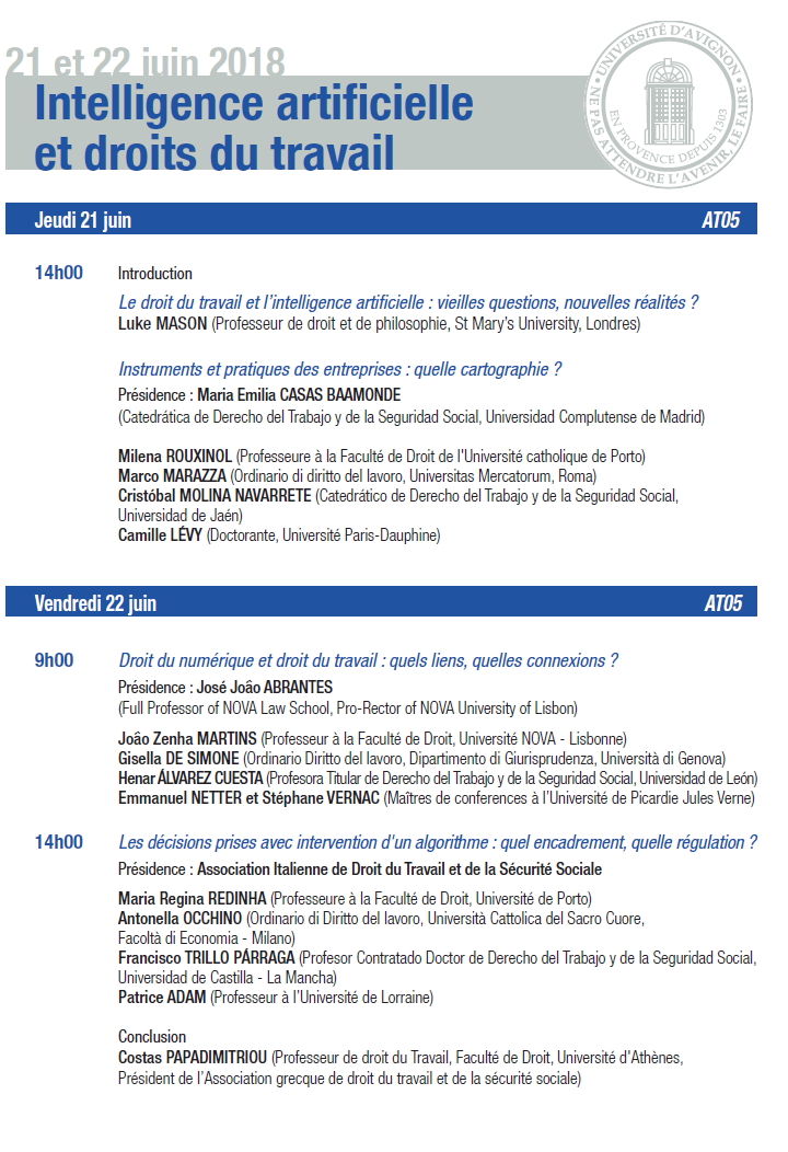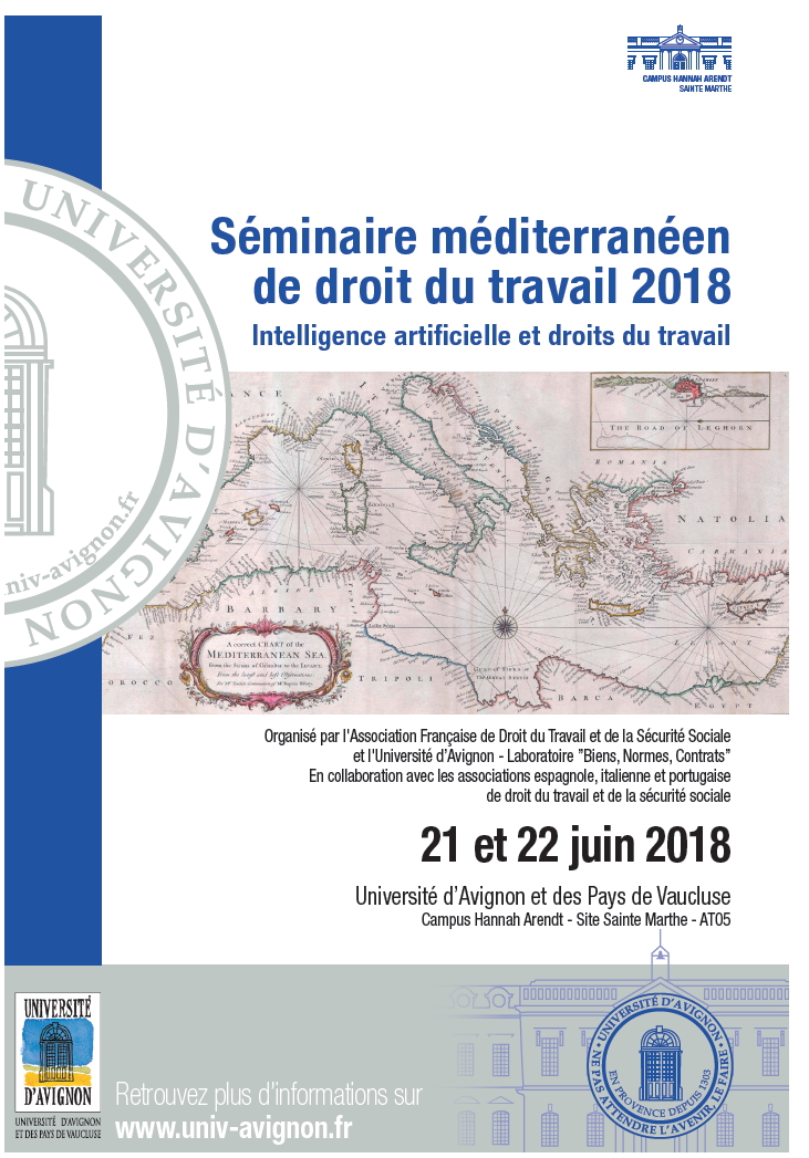 Da Gio, 21/06/2018 a Gio, 21/06/2018 Mode On-site-only 14/11/2022 AVIGNON - Séminaire méditerranéen de droit du travail 2018 - Intelligence artificielle et droits du travail (21 et 22 juin 2018) on-site only | Campus Hannah Arendt - Site Sainte Marthe