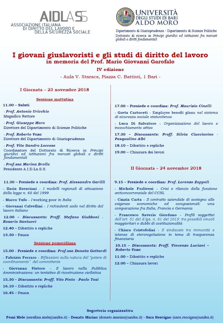 BARI - I giovani giuslavoristi e gli studi di diritto del lavoro in memoria del Prof. Mario Giovanni Garofalo (23-24 novembre 2018)