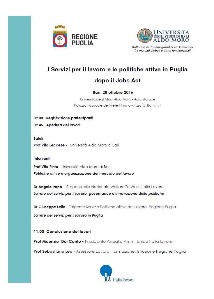 Da Ven, 28/10/2016 a Ven, 28/10/2016 Mode On-site-only 14/11/2022 BARI - I Servizi per il lavoro e le politiche attive in Puglia dopo il Jobs Act on-site only | P.zza C. Battisti ,1 - ore 9.00
