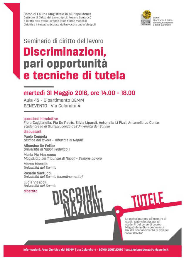 Da Mar, 31/05/2016 a Mar, 31/05/2016 Mode On-site-only 14/11/2022 BENEVENTO - Discriminazioni, pari opportunità e tecniche di tutela on-site only | Via Calandra, 4 - ore 14
