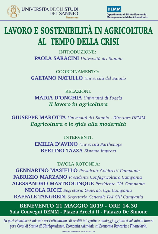 BENEVENTO - Lavoro e sostenibilità in agricoltura al tempo della crisi