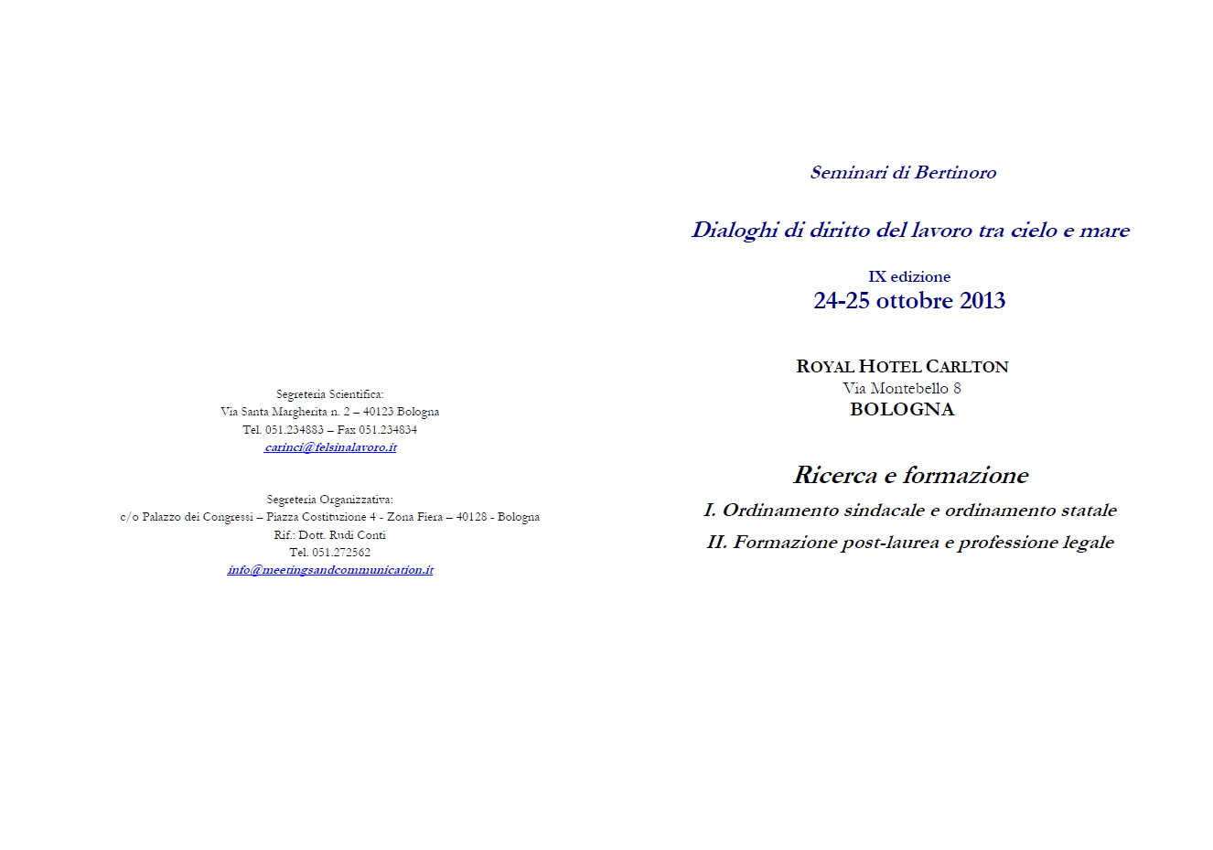 Da Gio, 24/10/2013 a Gio, 24/10/2013 Mode On-site-only 14/11/2022 BOLOGNA - Dialoghi di diritto del lavoro tra cielo e mare. Seminari di Bertinoro IX edizione (24-25 ottobre 2013) on-site only | via Montebello 8