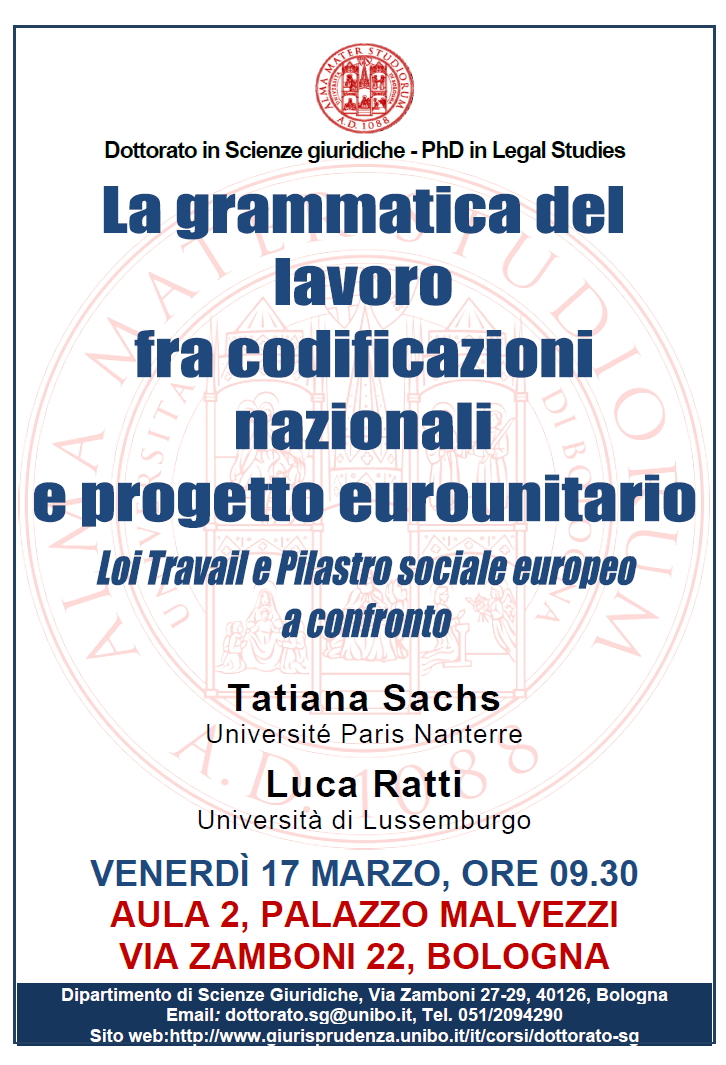 Da Ven, 17/03/2017 a Ven, 17/03/2017 Mode On-site-only 14/11/2022 BOLOGNA - La grammatica del diritto del lavoro fra codificazioni nazionali e progetto eurounitario. Loi Travail e Pilastro sociale europeo a confronto on-site only | Via Zamboni, 22 - ore 9.30