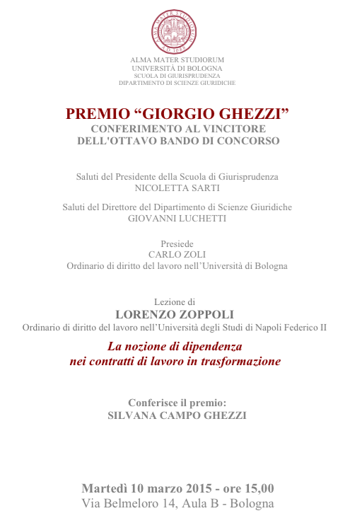 BOLOGNA - La nozione di dipendenza nei contratti di lavoro in trasformazione. Lezione del prof. L. Zoppoli in occazione del conferimento del premio “Giorgio Ghezzi”