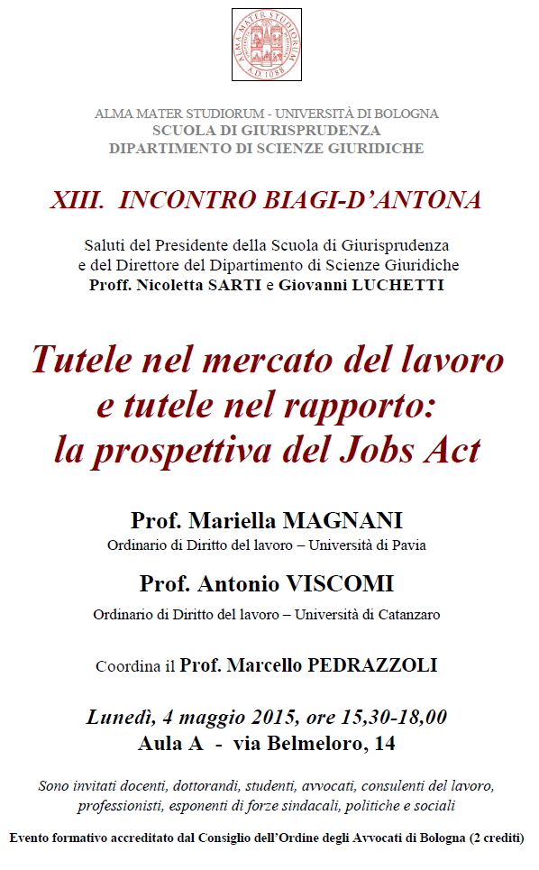 Da Lun, 04/05/2015 a Lun, 04/05/2015 Mode On-site-only 14/11/2022 BOLOGNA - XIII incontro Biagi-D'Antona - Tutele nel mercato del lavoro e tutele nel rapporto: la prospettiva del Jobs Act on-site only | via Belmeloro, 14 - 15.30