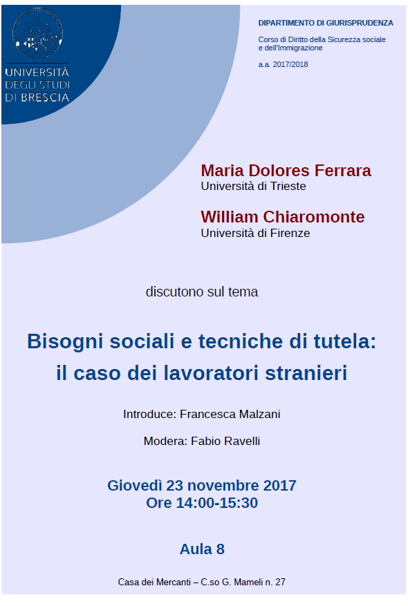 Da Gio, 23/11/2017 a Gio, 23/11/2017 Mode On-site-only 14/11/2022 BRESCIA - Bisogni sociali e tecniche di tutela: il caso dei lavoratori stranieri on-site only | C.so G. Mameli, 27 - ore 14