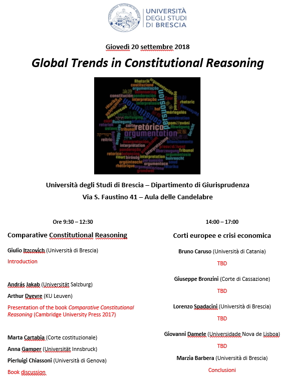 Da Gio, 20/09/2018 a Gio, 20/09/2018 Mode On-site-only 14/11/2022 BRESCIA - Global Trends in Constitutional Reasoning on-site only | Via S. Faustino 41 - ore 9.30