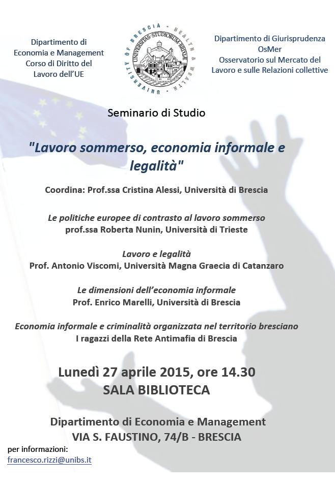 Da Lun, 27/04/2015 a Lun, 27/04/2015 Mode On-site-only 14/11/2022 BRESCIA - Lavoro sommerso, economia informale e legalità on-site only | Via S. Faustino, 74/B - 14.30