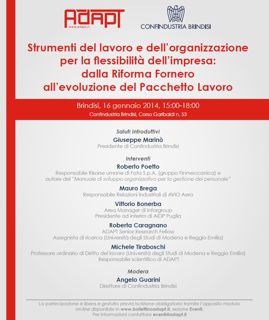 Da Gio, 16/01/2014 a Gio, 16/01/2014 Mode On-site-only 14/11/2022 BRINDISI - Strumenti del lavoro e dell’organizzazione per la flessibilità dell’impresa: dalla Riforma Fornero all’evoluzione del Pacchetto Lavoro on-site only | C.so Garibaldi 53 - 15.00