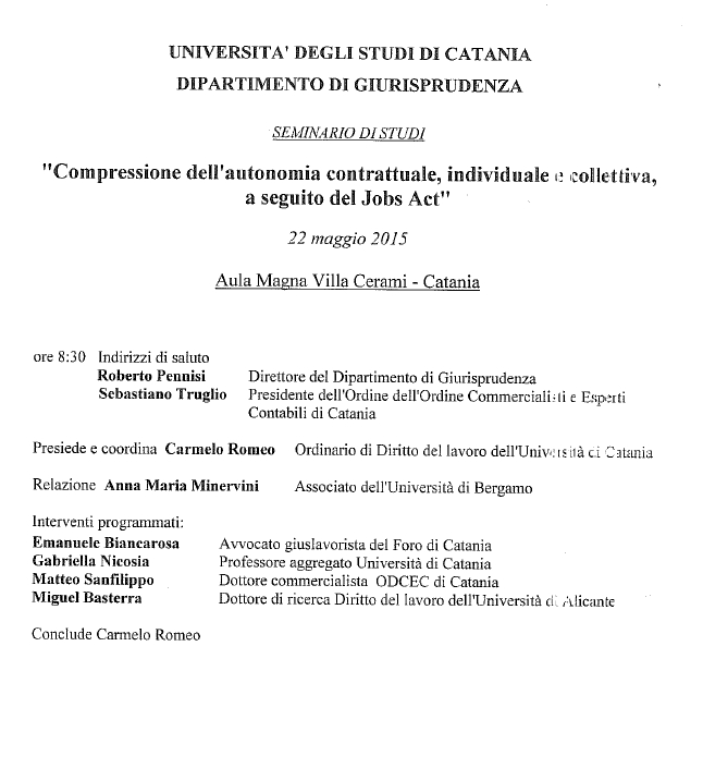 CATANIA - Compressione dell'autonomia contrattuale, individuale e collettiva, a seguito del Jobs Act