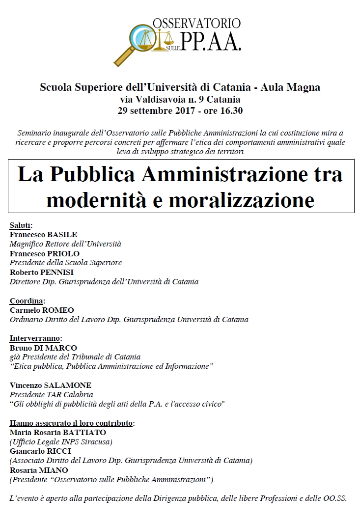 Da Ven, 29/09/2017 a Ven, 29/09/2017 Mode On-site-only 14/11/2022 CATANIA - La Pubblica Amministrazione tra modernità e moralizzazione on-site only | Via Valdisavoia, 9 - ore 16.30