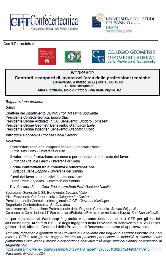 Architetti, ingegneri e geometri della Provincia di Benevento che vogliono seguire l’evento ma non avere i CFP e tutti gli altri soggetti interessati possono partecipare in modalità a distanza sulla piattaforma Cisco Webex, messa a disposizione dall’Università degli Studi del Sannio, collegandosi al seguente link: