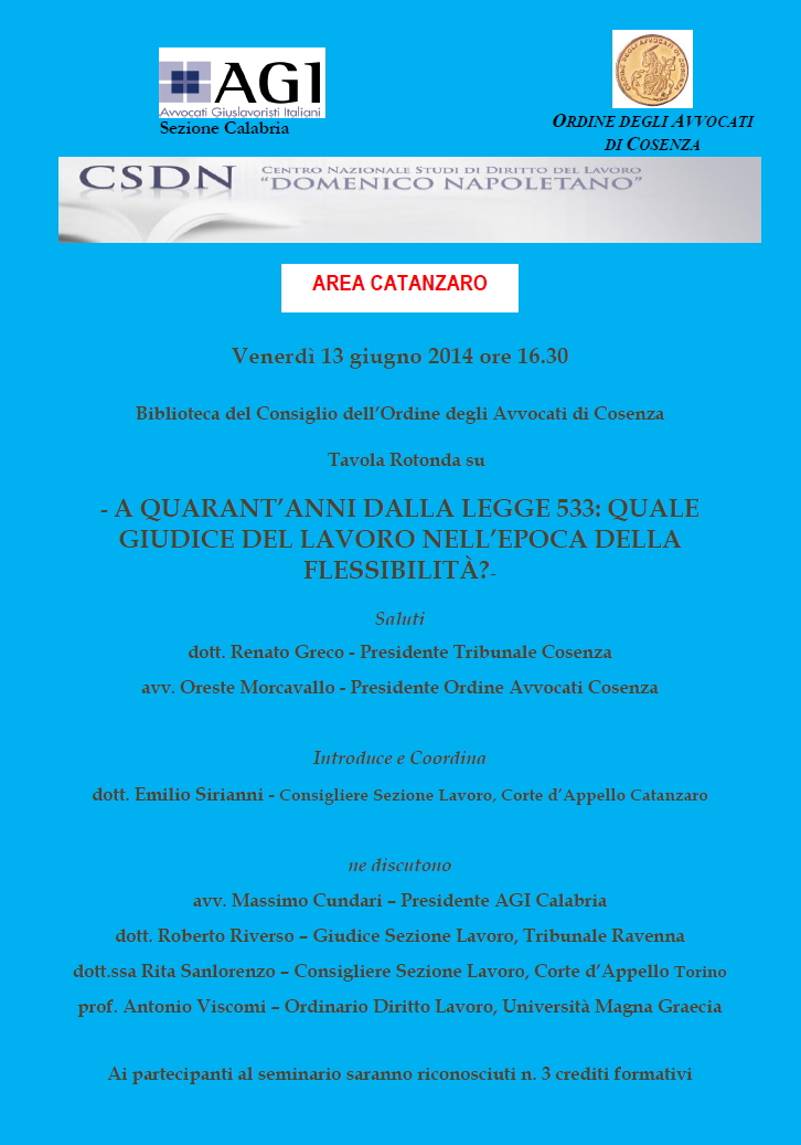 Da Ven, 13/06/2014 a Ven, 13/06/2014 Mode On-site-only 14/11/2022 COSENZA - A quarant’anni dalla Legge 533: quale giudice del lavoro nell’epoca della flessibilità? on-site only | biblioteca del Consiglio dell’Ordine degli Avvocati di Cosenza - 16,30