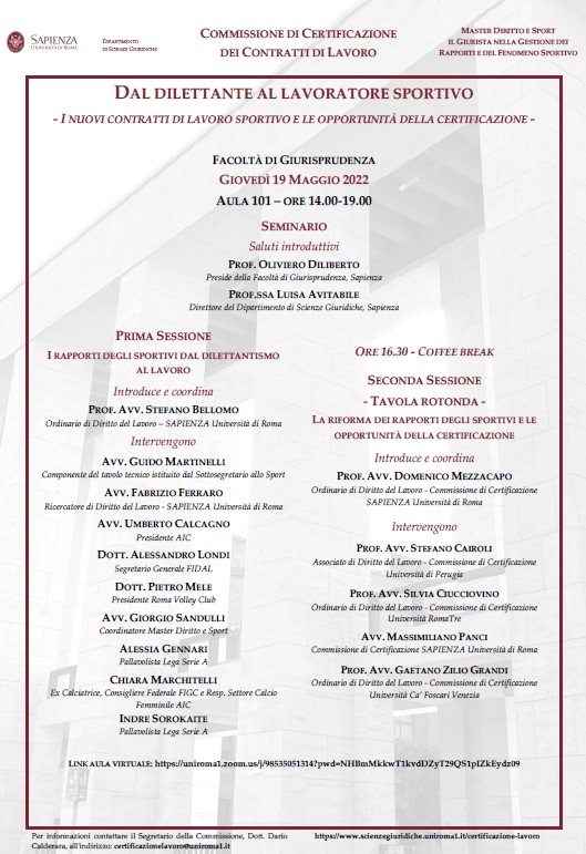 È possibile seguire l'evento anche da remoto LINK AULA VIRTUALE: https://uniroma1.zoom.us/j/98535051314?pwd=NHBmMkkwT1kvdDZyT29QS1pIZkEydz09