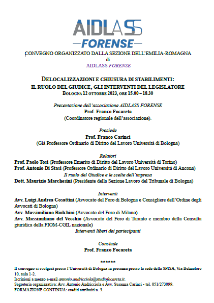 Segreteria organizzativa: Avv. Antonio Andricciola e Avv. Susanna Carinci - tel. 051/273099.