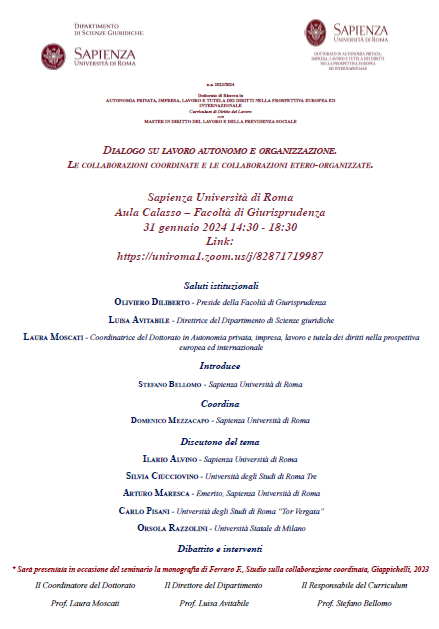 Sarà presentata in occasione del seminario la monografia di Ferraro F., Studio sulla collaborazione coordinata, Giappichelli, 2023