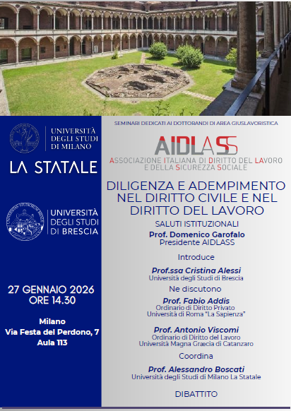 Da Mar, 27/01/2026 a Mar, 27/01/2026 Mode On-site-only File Programma940.3 KB 11/12/2025 Diligenza e adempimento nel diritto civile e nel diritto del lavoro on-site only h. 14:30 | Via Festa del Perdono 7, Milano Università Statale di Milano Aula 113