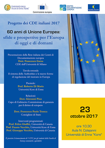 Da Lun, 23/10/2017 a Lun, 23/10/2017 Mode On-site-only 14/11/2022 ENNA - 60 anni di Unione Europea: sfide e prospettive per l'Europa di oggi e domani on-site only | Aula N. Colajanni - ore 10.30