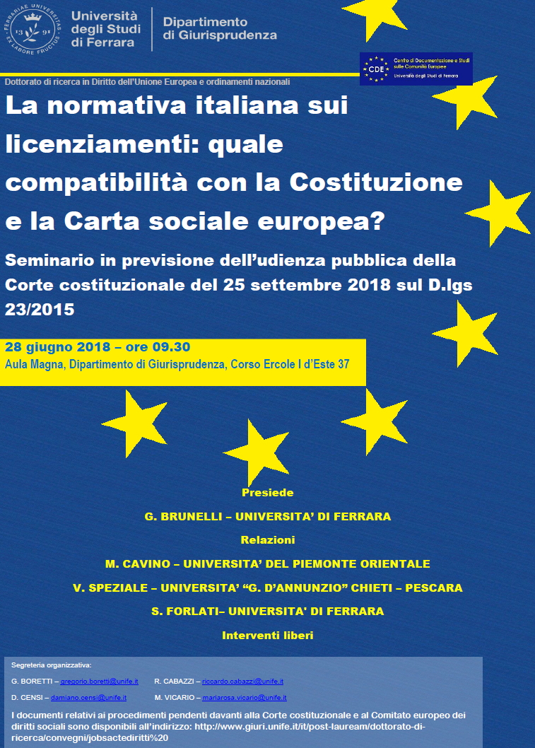 Da Gio, 28/06/2018 a Gio, 28/06/2018 Mode On-site-only 14/11/2022 FERRARA - La normativa italiana sui licenziamenti: quale compatibilità con la Costituzione e la Carta sociale europea? on-site only | Corso Ercole I d’Este, 37 - ore 9.30