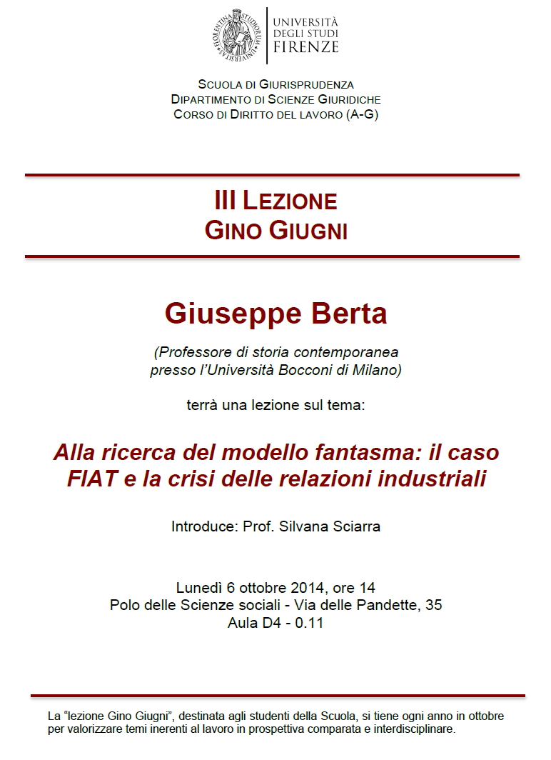 Da Lun, 06/10/2014 a Lun, 06/10/2014 Mode On-site-only 14/11/2022 FIRENZE - Alla ricerca del modello fantasma: il caso FIAT e la crisi delle relazioni industriali (prof. G. Berta) - III lezione Gino Giugni on-site only | via delle Pandette, 35 - 14:00