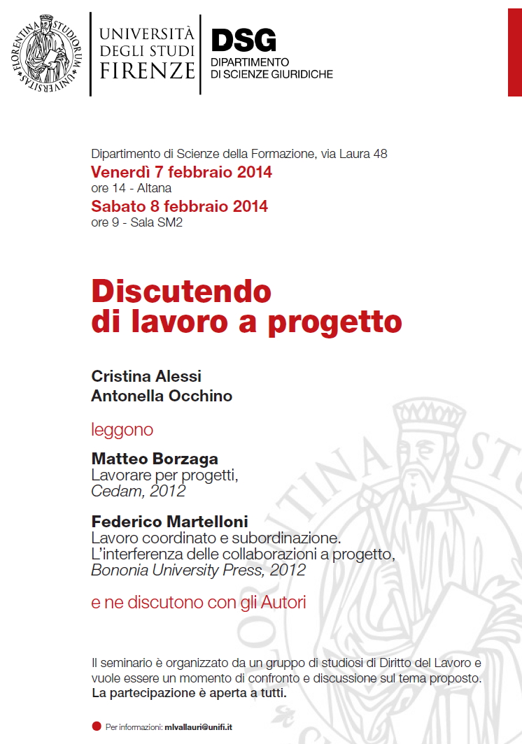 Da Ven, 07/02/2014 a Ven, 07/02/2014 Mode On-site-only 14/11/2022 FIRENZE - Discutendo di lavoro a progetto (7-8 febbraio) on-site only | via Laura 48