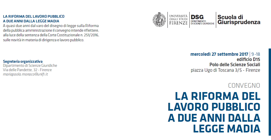 Da Mer, 27/09/2017 a Mer, 27/09/2017 Mode On-site-only 14/11/2022 FIRENZE - La riforma del lavoro pubblico a due anni dalla Legge Madia on-site only | Piazza Ugo di Toscana 3/5 - ore 9
