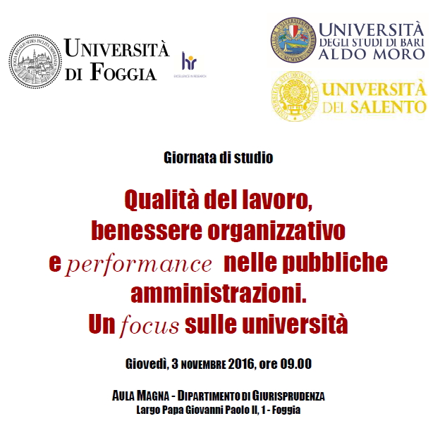 Da Gio, 03/11/2016 a Gio, 03/11/2016 Mode On-site-only 14/11/2022 FOGGIA - Qualità del lavoro, benessere organizzativo e performance nelle pubbliche amministrazioni. Un focus sulle università on-site only | Largo Papa Giovanni Paolo II, 1 - ore 9.00