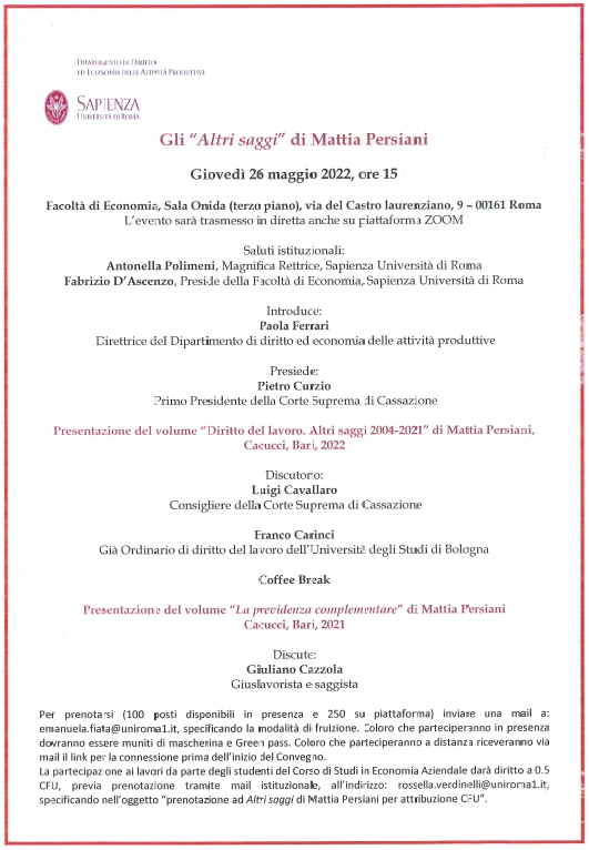 La partecipazione ai lavori da parte degli studenti del Corso di Studi in Economia Aziendale darà diritto a 0.5 CFU, previa prenotazione tramite mail istituzionale, all'indirizzo: rossella.verdinelli@uniromal.it, specificando nell'oggetto "prenotazione ad Altri saggi di Mattia Persiani per attribuzione CFU"