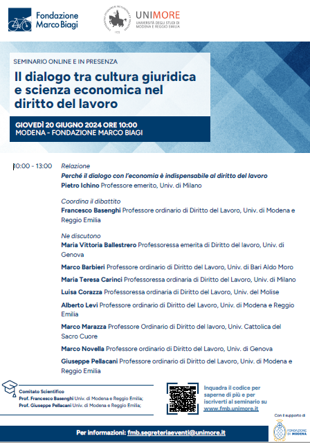Da Gio, 20/06/2024 a Gio, 20/06/2024 Mode Hybrid File Programma1.02 MB External Link Registrazione per partecipare al seminario 07/06/2024 Il dialogo tra cultura giuridica e scienza economica nel diritto del lavoro hybrid h. 10 Fondazione Marco Biagi L.go Marco Biagi 10, Modena Online tramite Teams