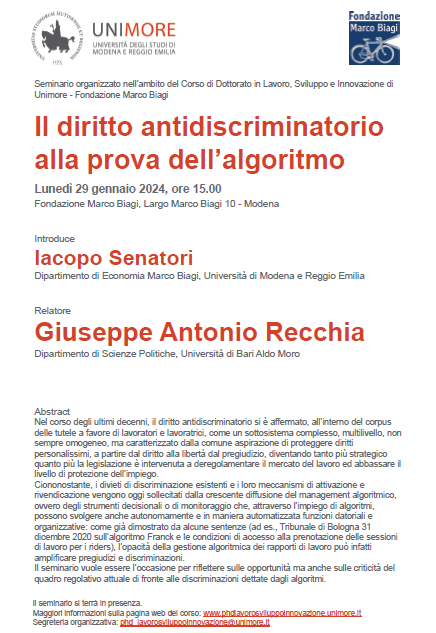 Seminario organizzato nell’ambito del Corso di Dottorato in Lavoro, Sviluppo e Innovazione di Unimore - Fondazione Marco Biagi