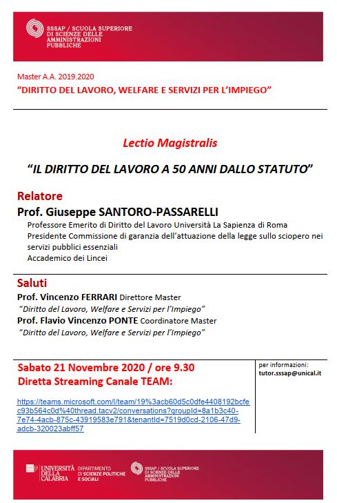 Da Sab, 21/11/2020 a Sab, 21/11/2020 Mode Online-only 14/11/2022 Il diritto del lavoro a 50 anni dallo Statuto online only | ore 9.30 (download locandina in formato .