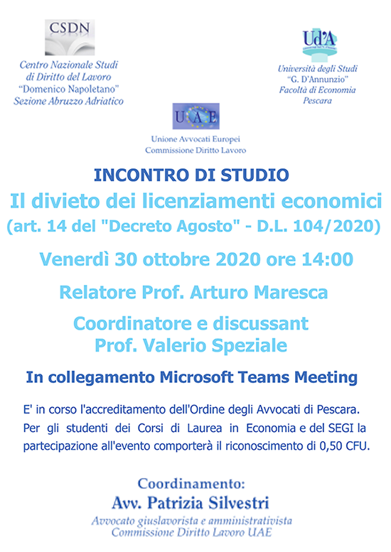 Da Ven, 30/10/2020 a Ven, 30/10/2020 Mode Online-only 14/11/2022 Il divieto dei licenziamenti economici (art.14 del "Decreto Agosto" D.L. 104/2020) online only | ore 14 Si prega di restituire la Seguirà link per il collegamento