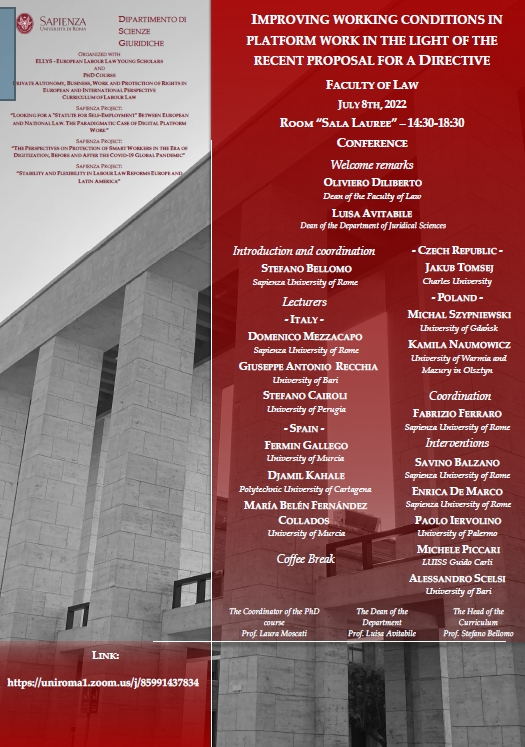 Da Ven, 08/07/2022 a Ven, 08/07/2022 Mode Hybrid File (download locandina)2.25 MB 28/06/2022 Improving Working Conditions in Platform Work in the Light of the Recent Proposal for a Directive hybrid h. 14.30 Sapienza Università di Roma Facoltà di Giurisprudenza - Sala Lauree Online: https://uniroma1.zoom.us/j/85991437834