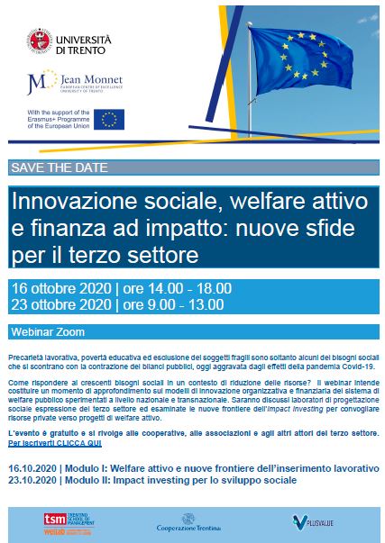 Innovazione sociale, welfare attivo e finanza ad impatto: nuove sfide per il terzo settore (16 e 23 ottobre 2020)