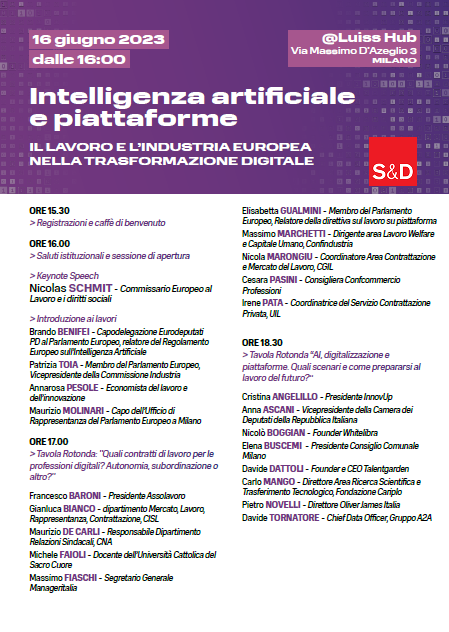 Da Ven, 16/06/2023 a Ven, 16/06/2023 Mode On-site-only File Programma333.4 KB 12/06/2023 Intelligenza artificiale e piattaforme on-site only h. 15:30 | Via Massimo D’Azeglio 3, Milano Il lavoro e l’industria europea nella trasformazione digitale