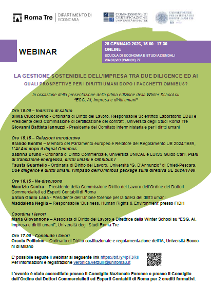 L'evento è organizzato dal Dipartimento di Economia e dalla Commissione di certificazione dell'Università degli Studi Roma Tre in collaborazione con l'Unione forense per la tutela dei diritti umani