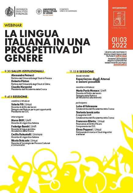 Questo evento nasce dalla collaborazione tra le Università di Firenze e di Udine ed ha ottenuto il patrocinio dell'Accademia della Crusca (https://accademiadellacrusca.it/it/contenuti/webinar-la-lingua-italiana-in-una-prospettiva-di-genere/21560).