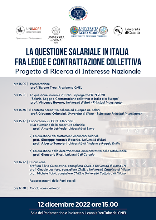 Da Lun, 12/12/2022 a Lun, 12/12/2022 Mode Hybrid File (download locandina)831.87 KB 08/11/2022 La questione salariale in Italia fra legge e contrattazione collettiva hybrid h. 15 Progetto di Ricerca di Interesse Nazionale Sala del Parlamentino e in diretta sul canale YouTube del CNEL