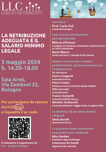 Da Ven, 03/05/2024 a Ven, 03/05/2024 Mode Hybrid File Programma307.01 KB 10/04/2024 La retribuzione adeguata e il salario minimo legale hybrid h. 14.30 LLC - Gruppo Dialoghi Sala Armi Via Zamboni 22, Bologna Per partecipare da remoto iscriviti QUI