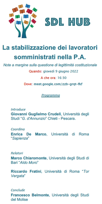 Da Gio, 09/06/2022 a Gio, 09/06/2022 Mode Online-only File (download locandina)229.07 KB 26/05/2022 La stabilizzazione dei lavoratori somministrati nella P.A. online only h.16.30 Per partecipare meet.google.com/zzb-grqt-fkf