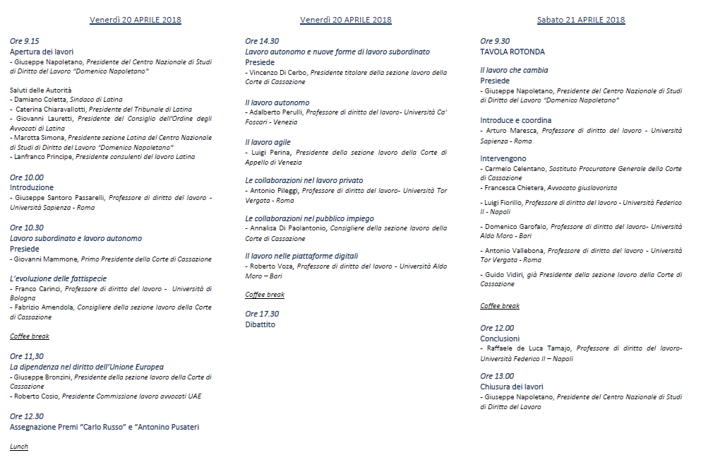Da Ven, 20/04/2018 a Ven, 20/04/2018 Mode On-site-only 14/11/2022 LATINA - Subordinazione ed autonomia nel lavoro che cambia (20-21 aprile 2018) on-site only | Via Sezze, 16 - ore 915