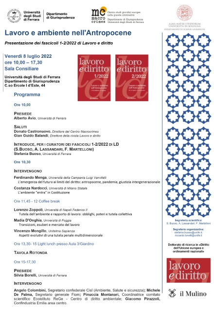 Da Ven, 08/07/2022 a Ven, 08/07/2022 Mode On-site-only File (download locandina)2.92 MB 22/06/2022 Lavoro e ambiente nell' Antropocene on-site only h. 10:00 | C.so Ercole I d'Este 44, Ferrara Presentazione dei fascicoli 1-2/2022 di Lavoro e diritto