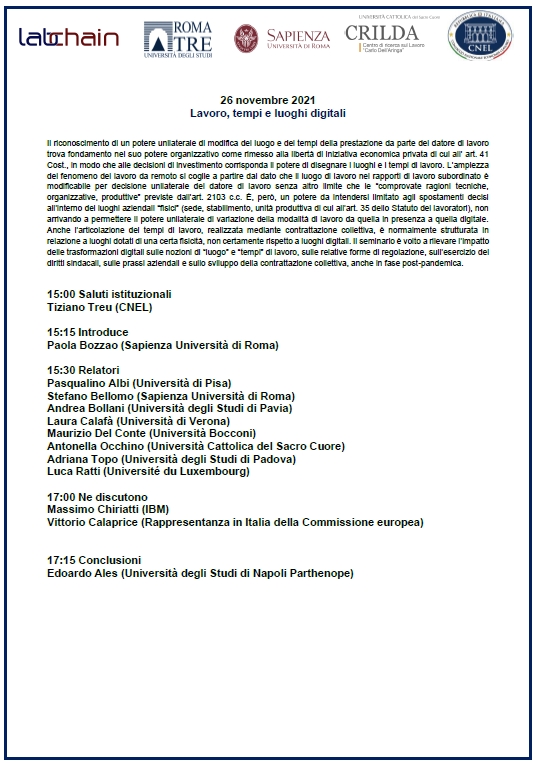 Anche l’articolazione dei tempi di lavoro, realizzata mediante contrattazione collettiva, è normalmente strutturata in relazione a luoghi dotati di una certa fisicità, non certamente rispetto a luoghi digitali. Il seminario è volto a rilevare l’impatto delle trasformazioni digitali sulle nozioni di “luogo” e “tempi” di lavoro, sulle relative forme di regolazione, sull’esercizio dei diritti sindacali, sulle prassi aziendali e sullo sviluppo della contrattazione collettiva, anche in fase post-pandemica.