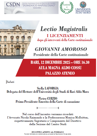 Da Ven, 12/12/2025 a Ven, 12/12/2025 Mode On-site-only File Programma1.25 MB 01/12/2025 Lectio Magistralis "I licenziamenti dopo gli interventi della Corte costituzionale" on-site only h. 16:30 | Via Scipione Crisanzio 1, Bari Università di Bari Aula Magna Aldo Cossu - Palazzo Ateneo