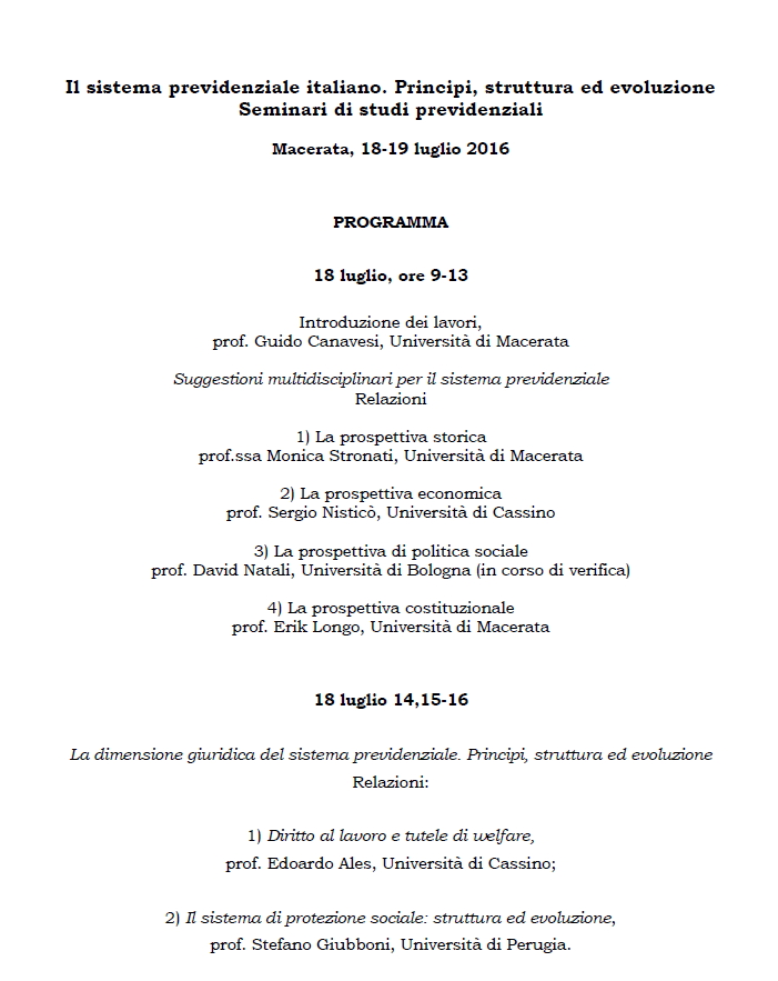 MACERATA - Il sistema previdenziale italiano. Principi, struttura ed evoluzione | Seminari di studi previdenziali (18-19 luglio 2016)